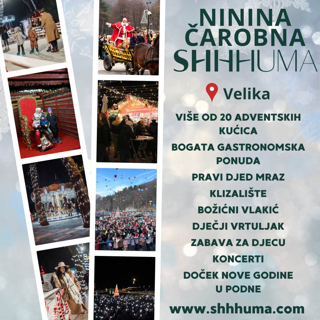 Započela je četvrta sezona Adventa Ninina Čarobna Shhhuma koji se održava u Aquaparku Shhhuma u Velikoj. I ove godine očekuje vas jedinstveno adventsko uređenje, dječja zabavna zona te vrhunski glazbeni program s brojnim domaćim i regionalnim izvođačima. Svake nedjelje u prosincu, od 17 do 20 sati, Djed Mraz šeta najčarobnijom Shhhuma, dijeli poklone i unosi veselje u svaki kutak, a najposebniji trenutak godine… doček Djeda Mraza s kočijom je 24. prosinca 2024. u 14 sati.