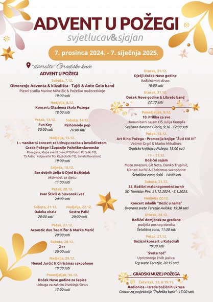 Mjesec dana trajat će Advent u Požegi čiji se središnji dio održava na prostoru iza Gradske kuće gdje je smješteno i klizalište. Programi se održavaju na još nekoliko lokacija u gradu, a Božićni sajam održat će se od 19. do 21. prosinca u Šetališnoj zoni. Najavljeni su i brojni koncerti, a dobra zabava svoj će vrhunac doživjeti 31. prosinca kada će se upriličiti Doček Nove godine uz Libreto band. No prije velikog slavlja održat će se Dječji doček Nove godine, a dan ranije čak i Doček Nove godine za šapice Udruge za zaštitu životinja Sirius.