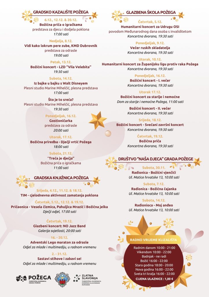 Od ostalih zanimljivosti iz programa izdvojimo uprizorenje živih jaslica 27. prosinca kada će se održati i Božićni koncert u Katedrali te paljenje svijeća na adventskom vijencu na Trgu sv. Terezije Avilske. Tijekom trajanja Adventa u Požegi veliku pažnju zasigurno će privući i klizalište koje će biti otvoreno do 7. siječnja 2025. Radno vrijeme radnim danom je od 10 do 21 sat, a vikendima od 10 do 22 sata uz posebno radno vrijeme na blagdane. Klizati se možete po cijeni od samo 1 euro.