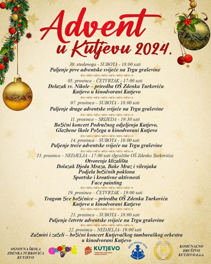 Manifestacija ispunjena blagdanskim duhom i radošću donosi nezaboravne trenutke za sve generacije. Ovaj poseban događaj, koji okuplja brojne lokalne partnere, donosi čaroliju zajedništva uoči najljepšeg doba godine. Programi će se održavati na nekoliko lokacija, a traje do 22. prosinca kada će se održati “Zažmiri i zaželi – božićni koncert Kutjevačkog tamburaškog orkestra”. Adventske svijeće pale se svake subote na Trgu graševine.