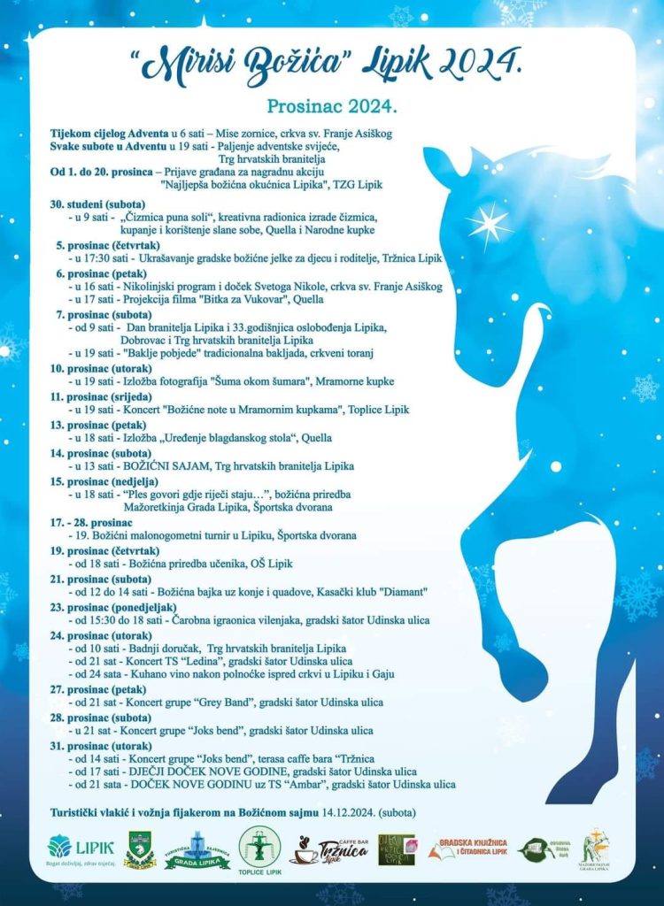 Tijekom prosinca u Lipiku se održavaju zabavni programi, nastupi, izložbe i predstavljanja. Za vrijeme trajanja manifestacija posjetitelji imaju jedinstvenu priliku provozati se Lipikom s turističkim vlakićem Lipik Express i adventskim fijakerom Državne ergele Lipik, uživati u kreacijama ugostitelja te prošetati zimskim parkom.