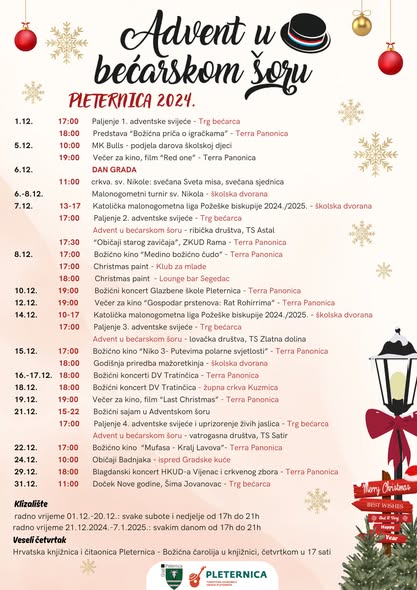 Program uključuje i Čarobnu igraonicu vilenjaka – 23. prosinca te Božićni malonogometni turnir od 17. do 28. prosinca, a blagdanske glazbene večeri i zabave prate cijeli prosinac. Nova 2025. godina dočekuje se uz tamburaški sastav i vatromet, a istoga dana u poslijepodnevnim satima upriličit će se i Dječji doček Nove godine.
