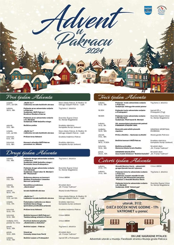 Advent u Pakracu donosi mnoštvo događanja i blagdanskog duha na Trgu bana Jelačića te drugim lokacijama u gradu. Među istaknutim događajima je Dječji doček Nove godine 31. prosinca na gradskoj šetnici ispred ureda Turističke zajednice. U ponoć, Pakračani i njihovi gosti ući će u 2025. godinu uz spektakularni vatromet.