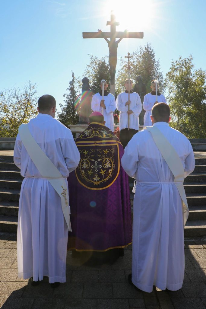 Na početku misnog slavlja biskupa je pozdravio rektor Šestak uputivši njemu i svim hodočasnicima srdačne riječi dobrodošlice. Zahvaljujući na pozdravu biskup je podsjetio nazočne kako su u pobožnosti križnoga puta razmišljali o otajstvu Isusove muke, smrti i uskrsnuća te je ustvrdio kako je ono sažeto u otajstvu presvete euharistije u ovom svetištu gdje ih je danas okupila nebeska majka Marija kao svoje sinove i kćeri. Istaknuo je kako su svjesni da ih samo Gospodin i Njegova Majka mogu ojačati u vjeri, čuvati ih i prosvijetliti. „Ovo zajedništvo po svetom slavlju povezuje nas ne samo kao biskupiju i hodočasnike u Mariji Bistrici, nego i s cijelom Crkvom, sa Svetim Ocem i njegovim nakanama“, naglasio je biskup. Pozvao je vjernike na molitvu za mir u svijetu, osobito za prestanak rata u Ukrajini i Palestini, te za bolesnike, patnike, umiruće i sve koji trpe i imaju životne teškoće. Zaključio je pozivom da sve što vjernici nose u svojim srcima prinesu na Gospodinov oltar, preporučujući sve moćnom zagovoru Blažene Djevice Marije.