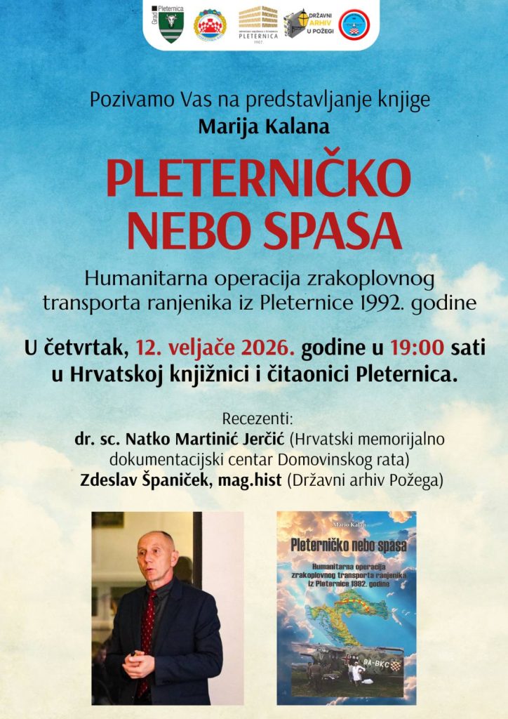 U četvrtak, 12. veljače 2026. godine, u prostoru Hrvatske knjižnice i čitaonice Pleternica, s početkom u 19:00 sati, održat će se predstavljanje knjige „Pleterničko nebo spasa“ autora Marija Kalana, umirovljenog bojnika.