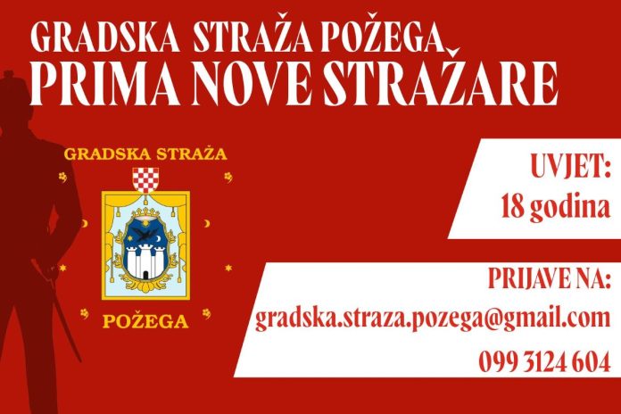 Gradska straža Požega otvorila je prijave za nove članove, pružajući priliku svima koji žele aktivno sudjelovati u očuvanju tradicije i kulturne baštine. Riječ je o udruzi koja njeguje povijesni identitet grada, redovito sudjeluje u kulturnim i svečanim događanjima te promiče vrijednosti discipline, odgovornosti i zajedništva.